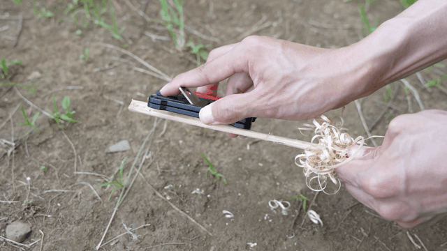 アウトドアでは、着火しやすい細い削りくず(フェザースティック)を素早く作れます。これはカードサイズでも日本製の精度が効いているからできる芸当です。
